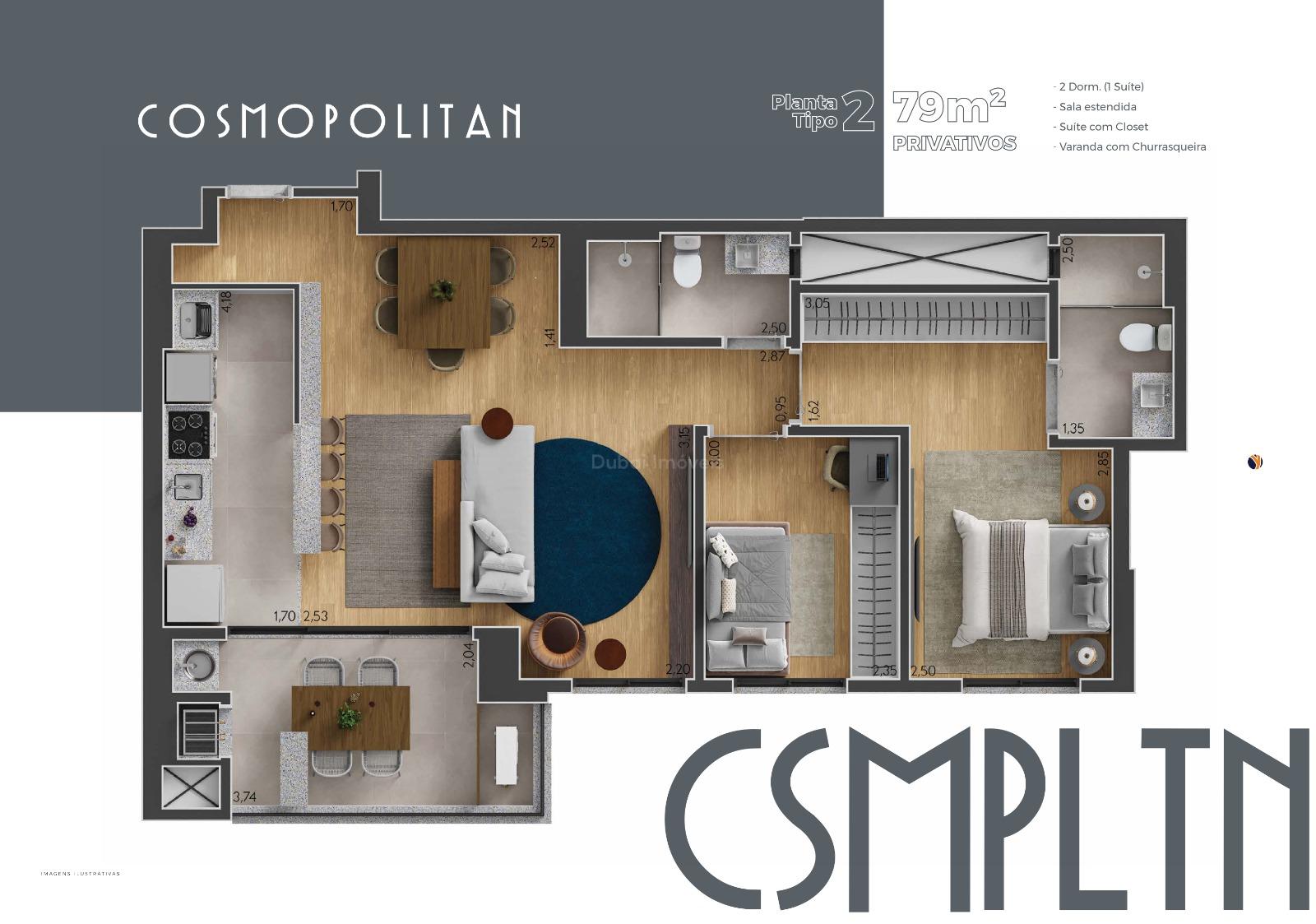 Apartamento planta de 79m², sendo 1 suíte com closet + 1 quarto, banheiro social, sala estendida com churrasqueira na varanda, cozinha e lavanderia e 1 vaga de garagem coberta.