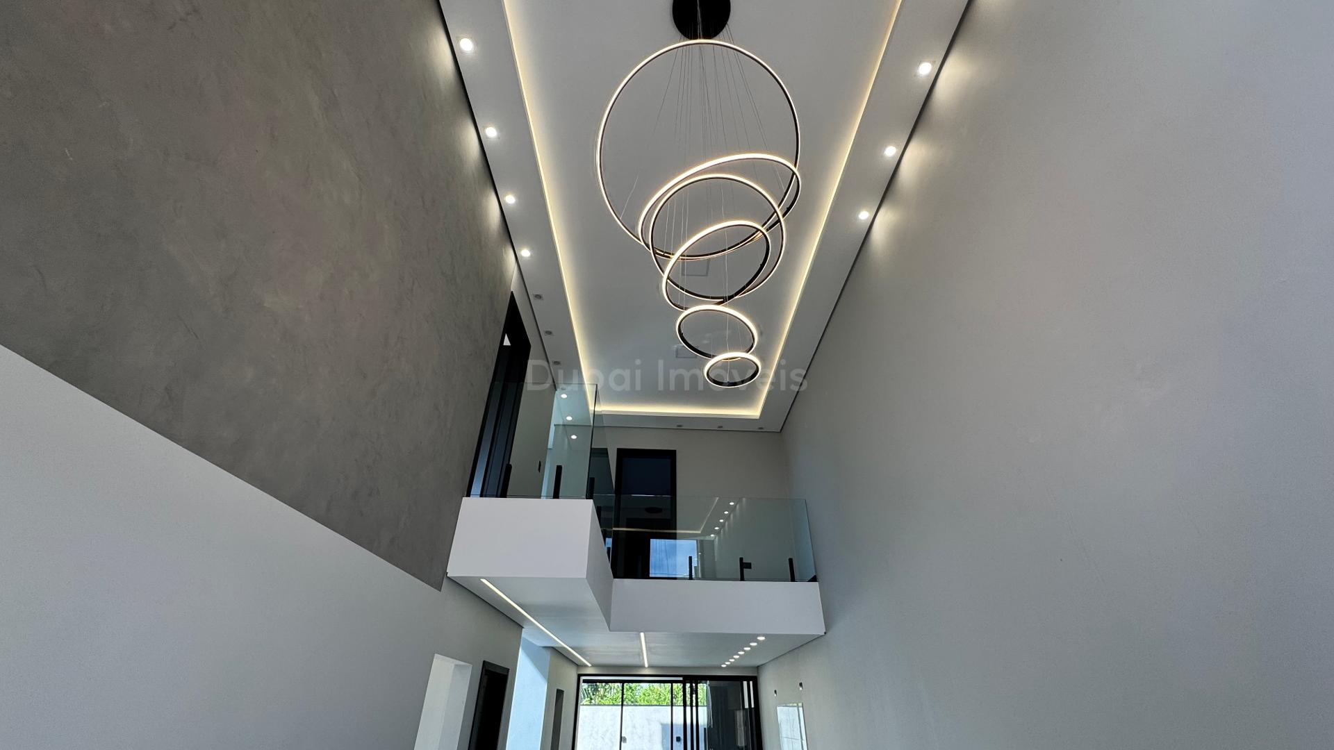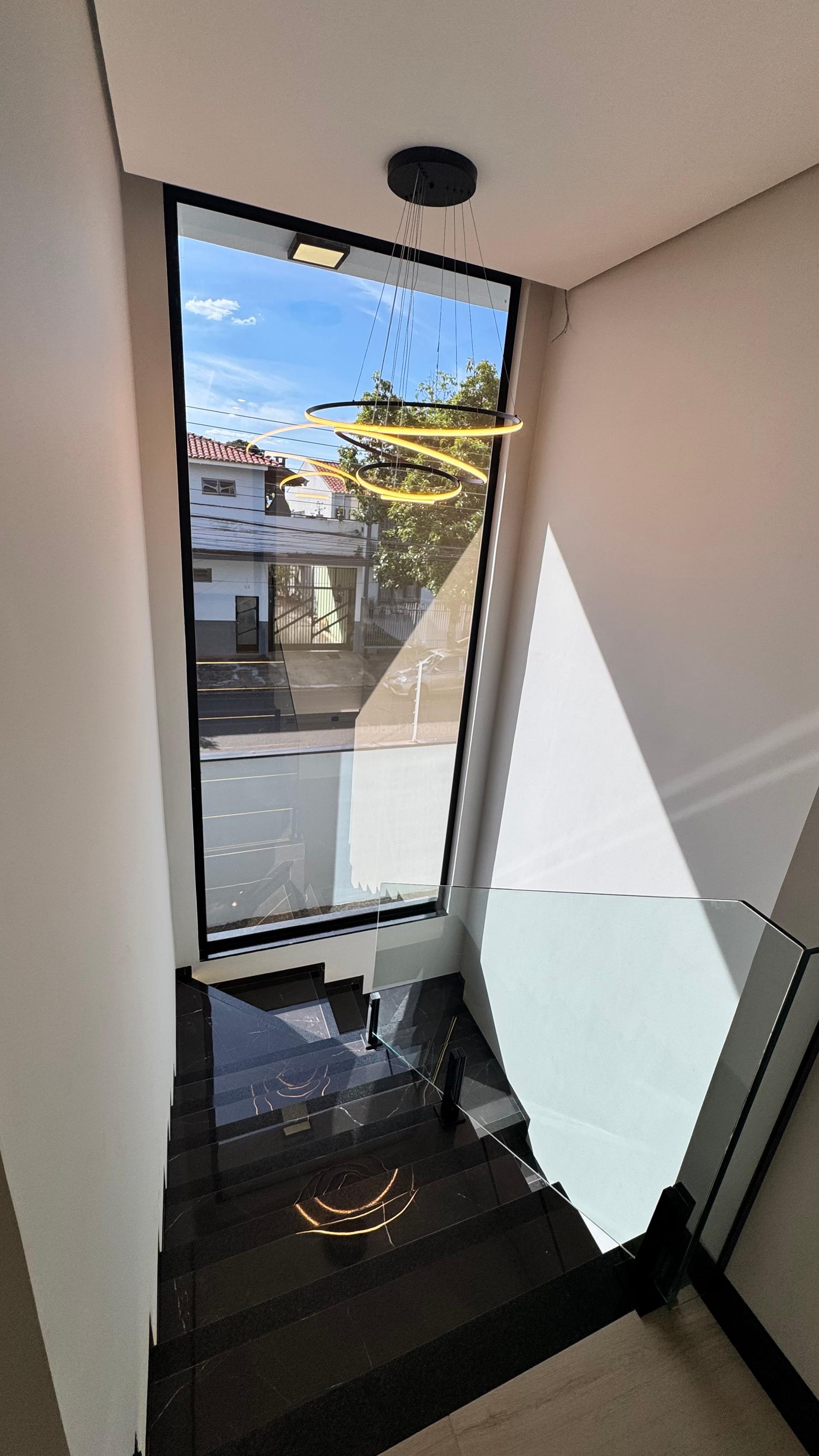 - Escada principal com lustre e iluminação nos degrais.
